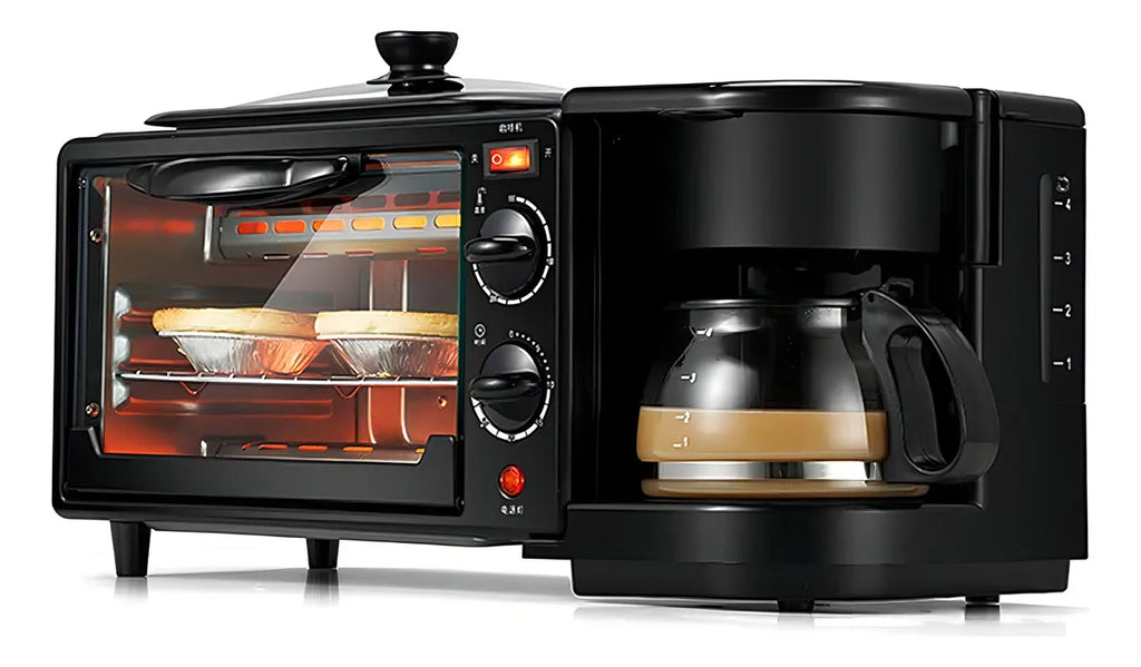 Es un electrodoméstico multifuncional que combina cafetera, horno eléctrico y grill, diseñado para quienes quieren rapidez, ahorro de espacio y versatilidad en la cocina.